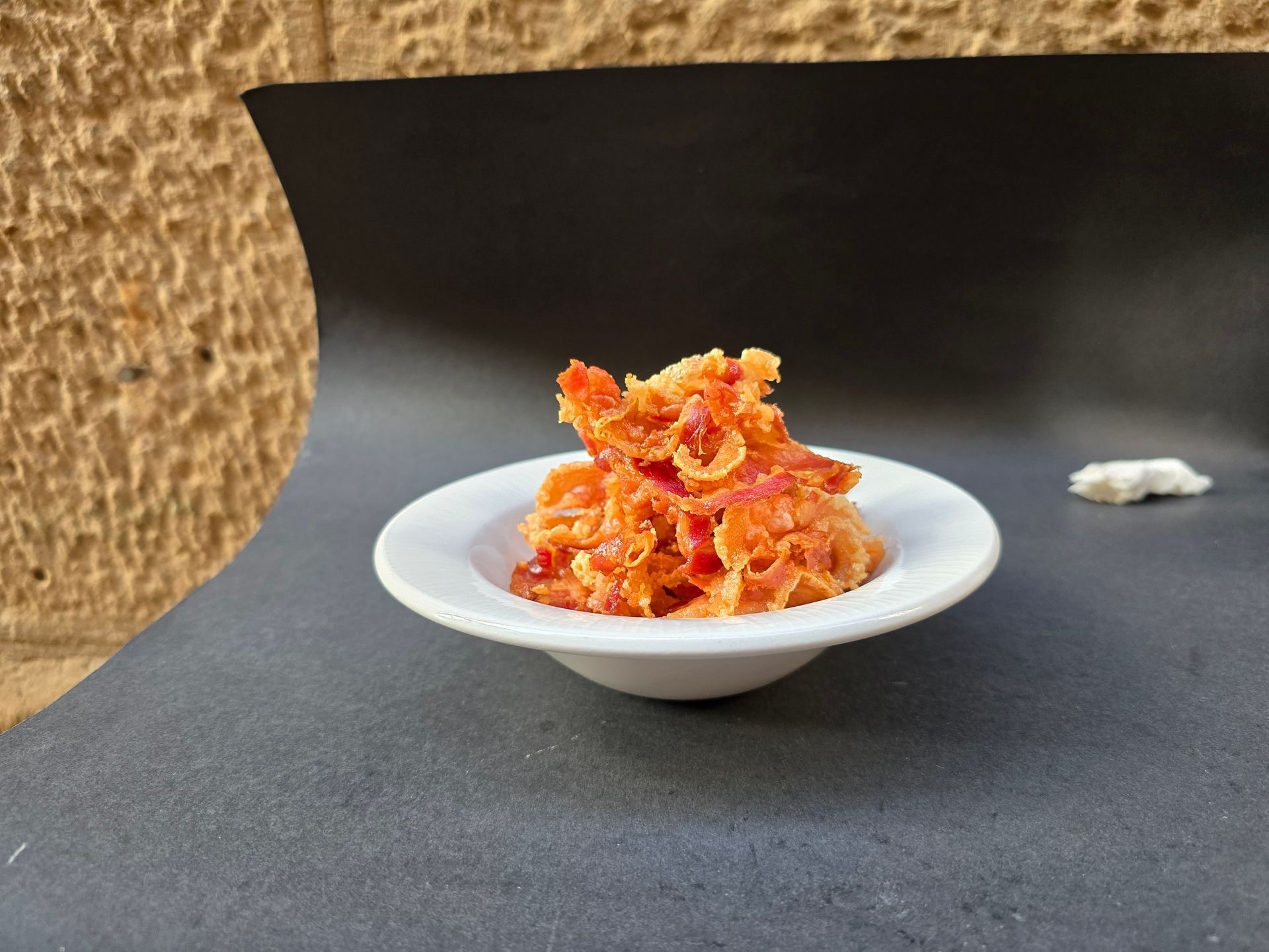 Panceta ibérica laminada finamente (2-3 mm de grosor).